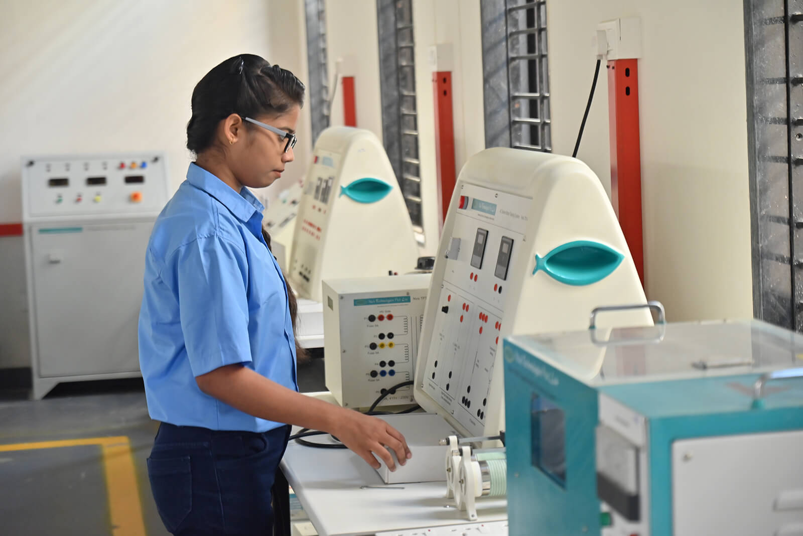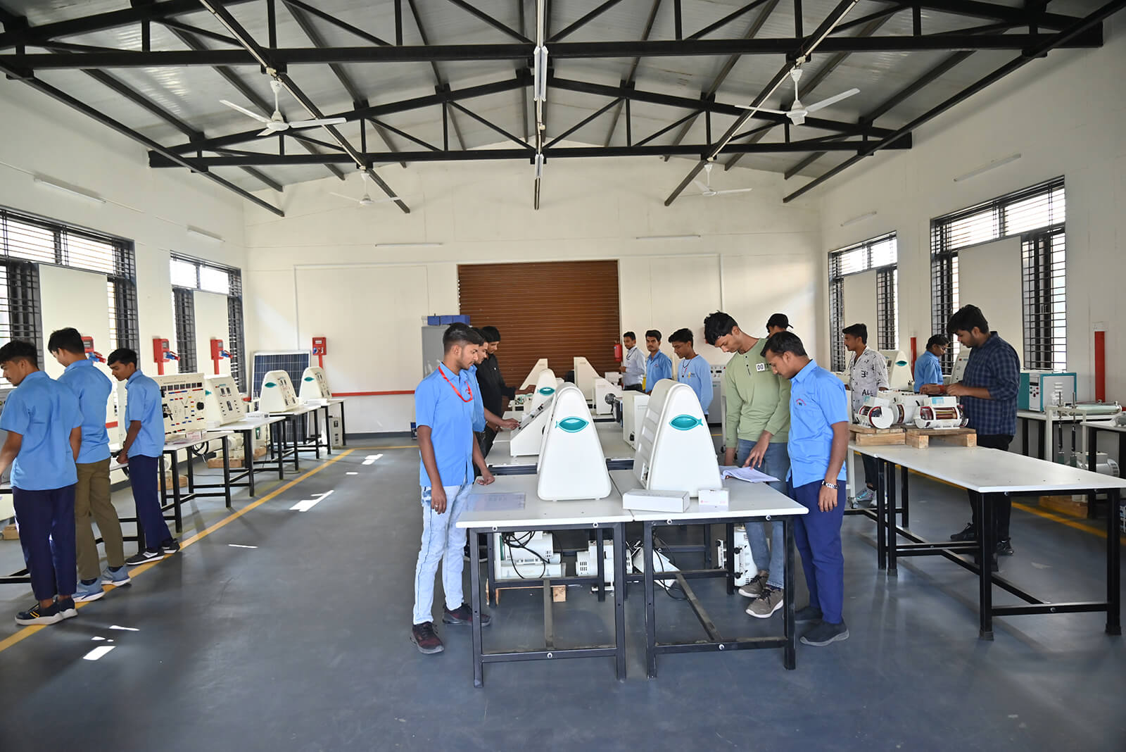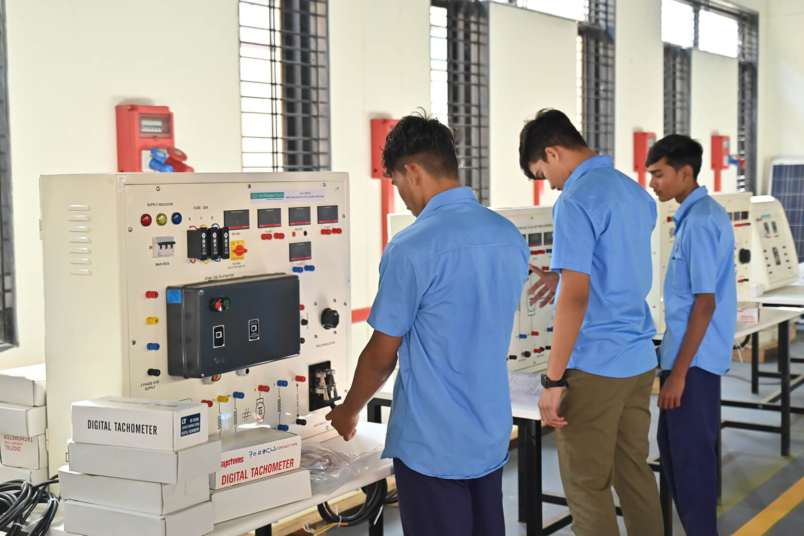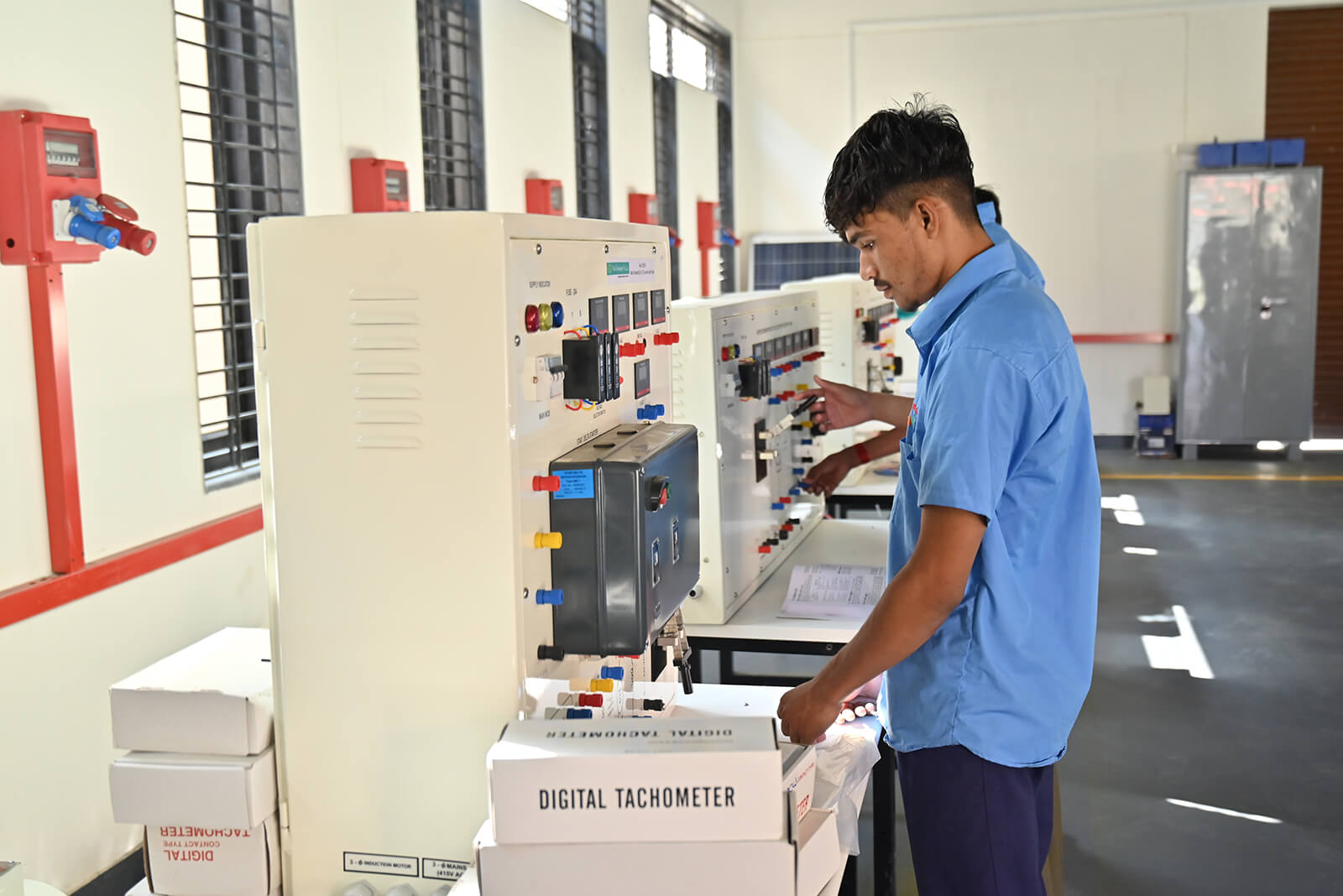 SECOND YEAR: In this year the trainee will study the details of electrical rotating machines viz. DC machines, induction motors, alternators & MG sets and practice on them. The trainee will practice on determining characteristics, their performance analysis, starting, speed control and reversing direction of rotation of machines. He will practice on parallel operation & synchronization of alternators, winding practice and over hauling will be practiced for DC machine and induction motors. Practices on diodes for bridge rectifier, switching devices & amplifiers by electronic components, different wave shape generation and testing by CRO. Designing control cabinet, assembling control elements and their wiring are to be practiced. Speed control of AC/DC motors by electronic controller will be practiced. The trainee will practice on testing, analyzing and repairing of voltage stabilizer, emergency light, battery charger, UPS and inverter. He will gain knowledge of thermal, hydel, solar & wind energy systems. The trainee will practice on distribution system, domestic service line and accessories & their protection by practicing on relay and circuit breaker for operation and maintenance. Install and troubleshoot Electric Vehicle charging stations.