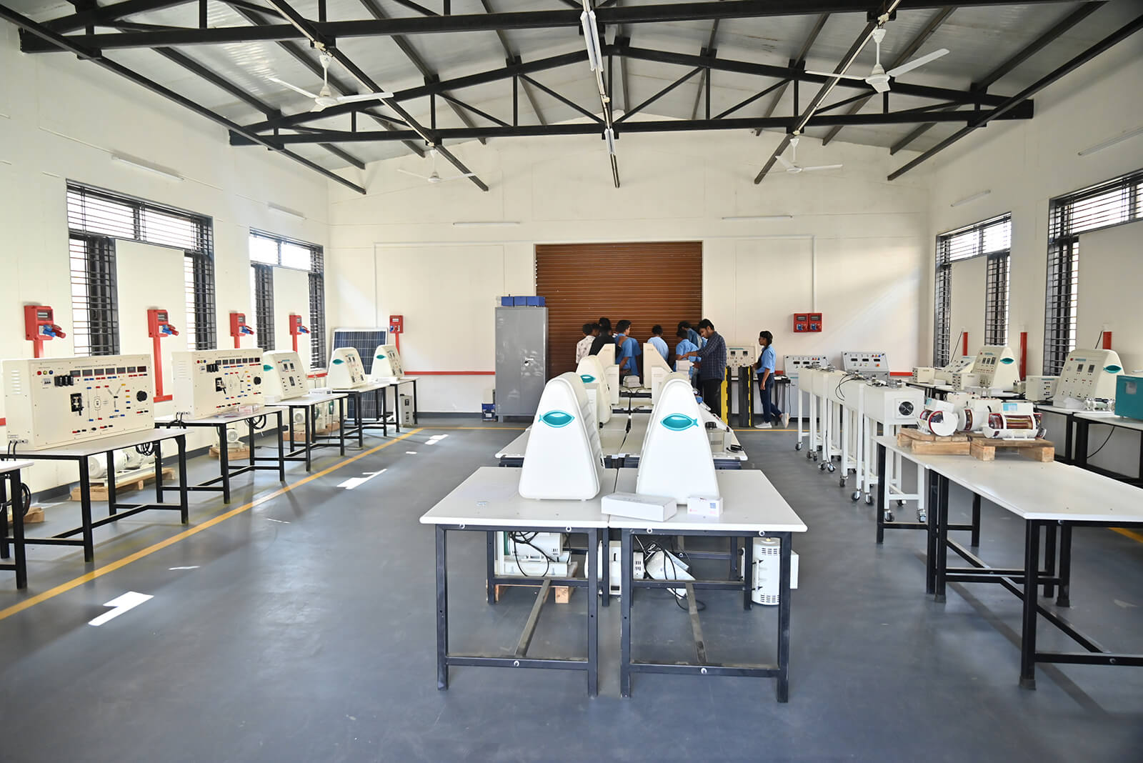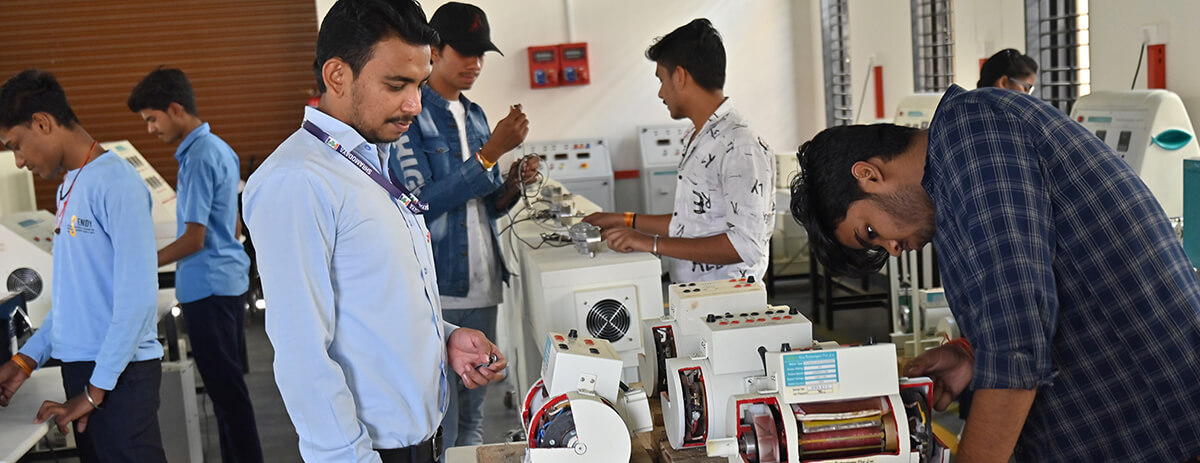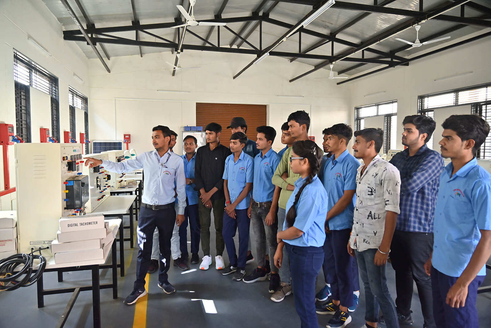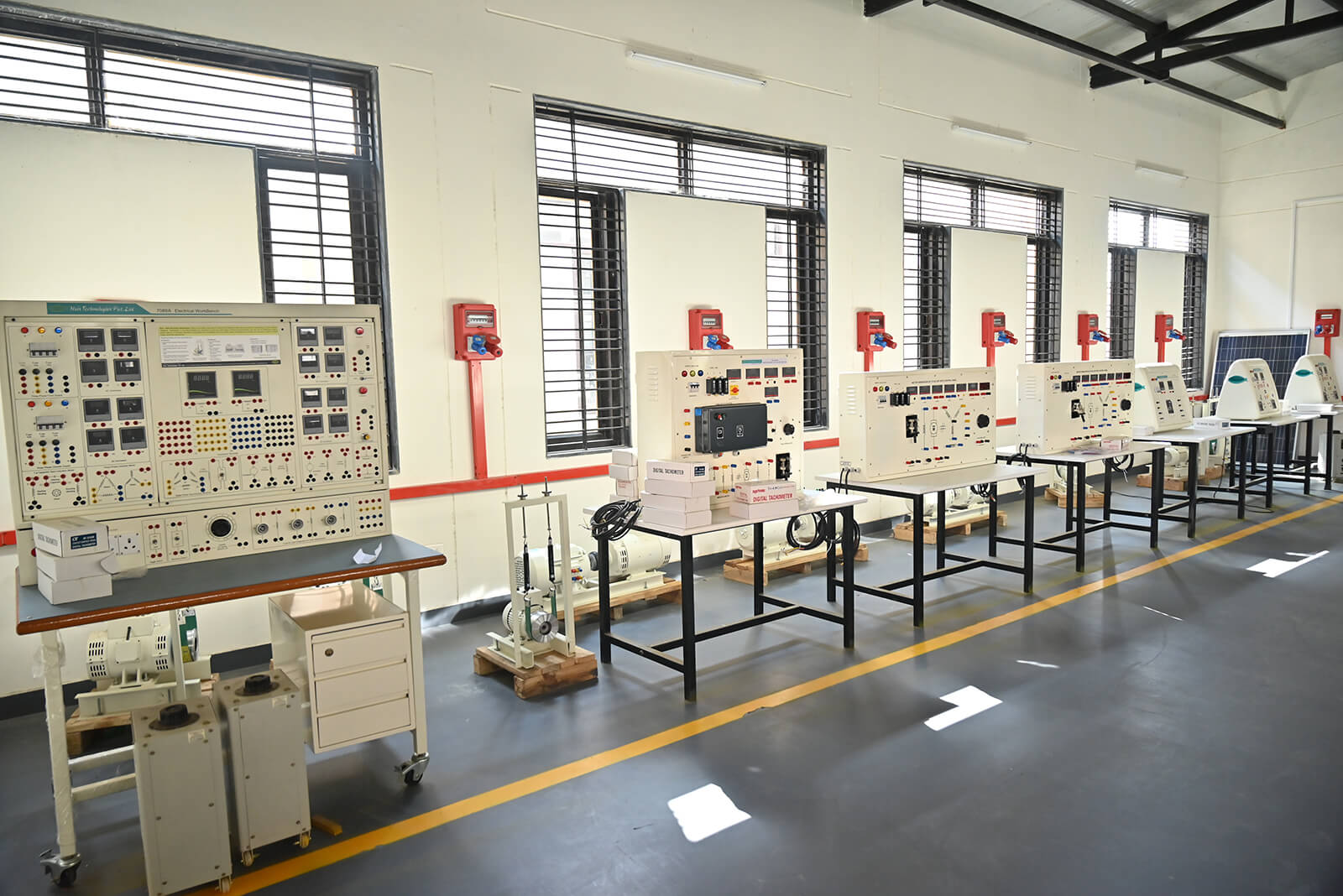 SECOND YEAR: In this year the trainee will study the details of electrical rotating machines viz. DC machines, induction motors, alternators & MG sets and practice on them. The trainee will practice on determining characteristics, their performance analysis, starting, speed control and reversing direction of rotation of machines. He will practice on parallel operation & synchronization of alternators, winding practice and over hauling will be practiced for DC machine and induction motors. Practices on diodes for bridge rectifier, switching devices & amplifiers by electronic components, different wave shape generation and testing by CRO. Designing control cabinet, assembling control elements and their wiring are to be practiced. Speed control of AC/DC motors by electronic controller will be practiced. The trainee will practice on testing, analyzing and repairing of voltage stabilizer, emergency light, battery charger, UPS and inverter. He will gain knowledge of thermal, hydel, solar & wind energy systems. The trainee will practice on distribution system, domestic service line and accessories & their protection by practicing on relay and circuit breaker for operation and maintenance. Install and troubleshoot Electric Vehicle charging stations.