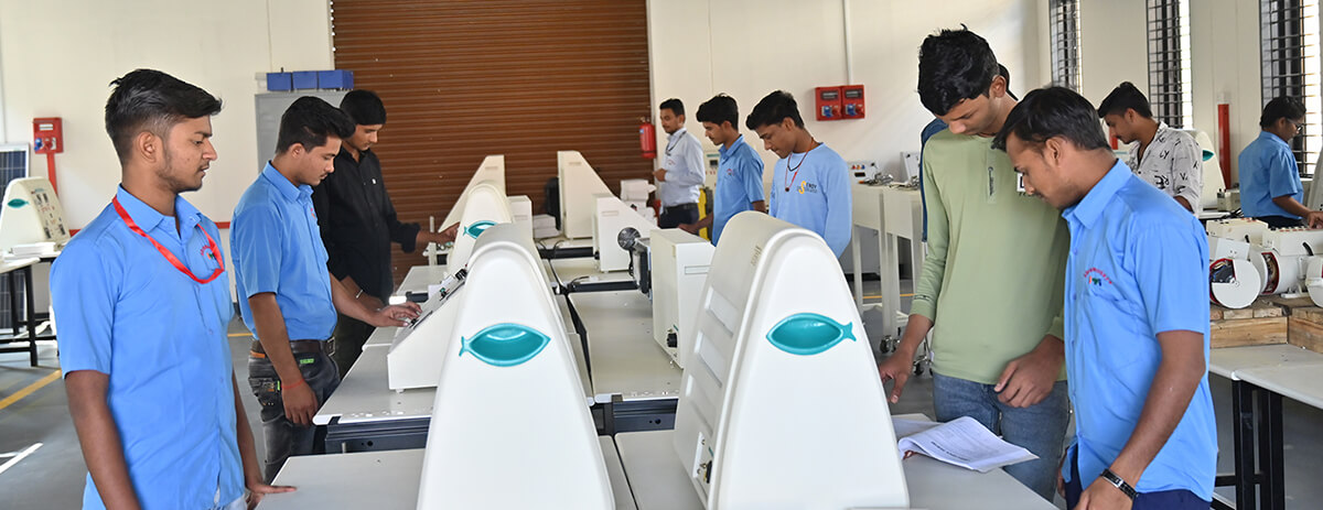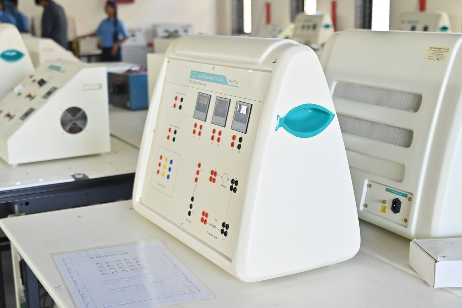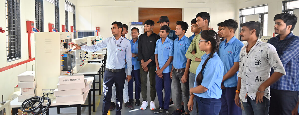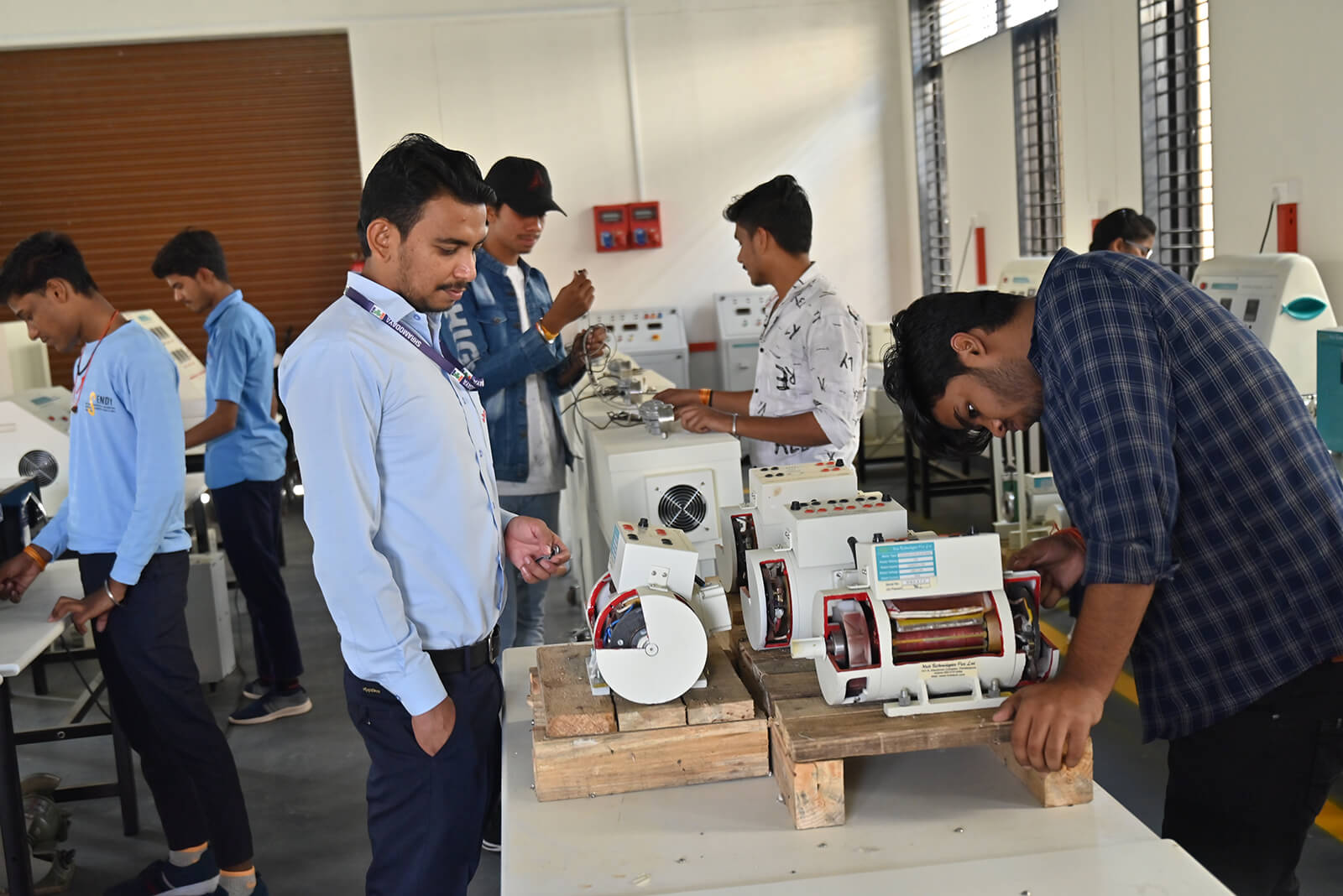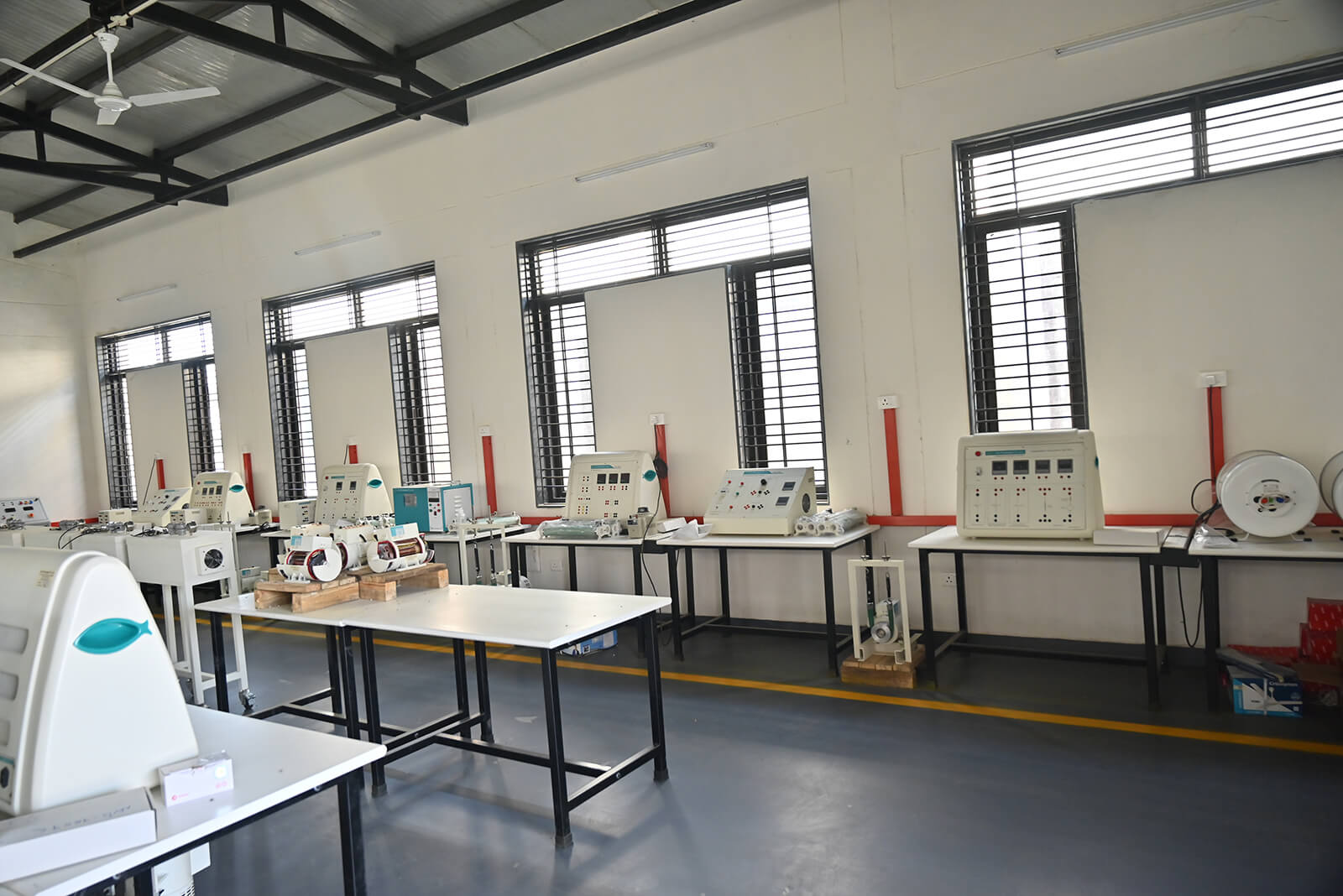 SECOND YEAR: In this year the trainee will study the details of electrical rotating machines viz. DC machines, induction motors, alternators & MG sets and practice on them. The trainee will practice on determining characteristics, their performance analysis, starting, speed control and reversing direction of rotation of machines. He will practice on parallel operation & synchronization of alternators, winding practice and over hauling will be practiced for DC machine and induction motors. Practices on diodes for bridge rectifier, switching devices & amplifiers by electronic components, different wave shape generation and testing by CRO. Designing control cabinet, assembling control elements and their wiring are to be practiced. Speed control of AC/DC motors by electronic controller will be practiced. The trainee will practice on testing, analyzing and repairing of voltage stabilizer, emergency light, battery charger, UPS and inverter. He will gain knowledge of thermal, hydel, solar & wind energy systems. The trainee will practice on distribution system, domestic service line and accessories & their protection by practicing on relay and circuit breaker for operation and maintenance. Install and troubleshoot Electric Vehicle charging stations.