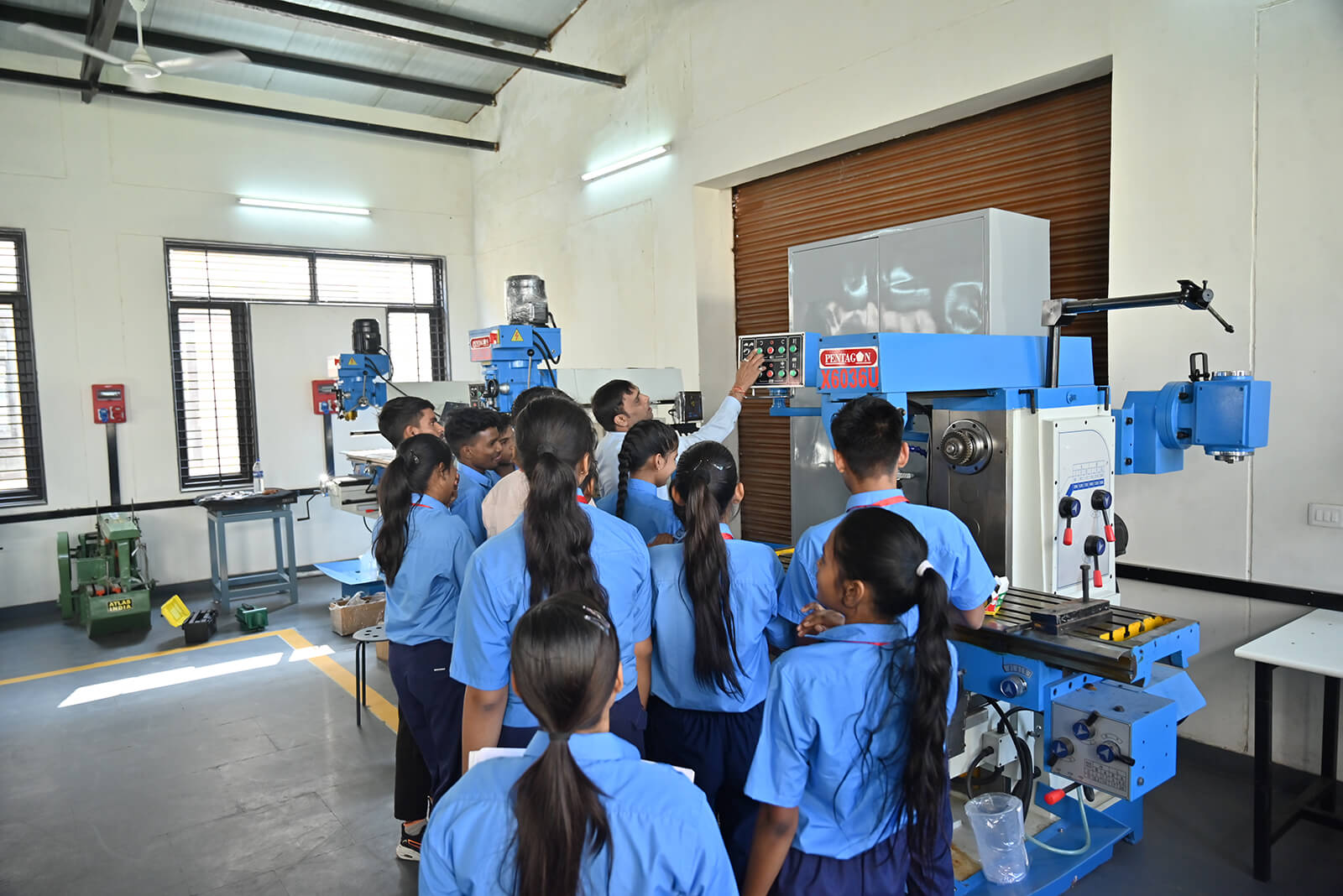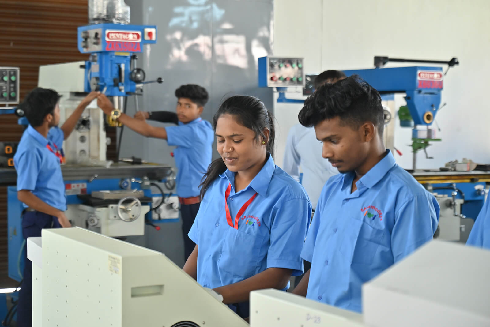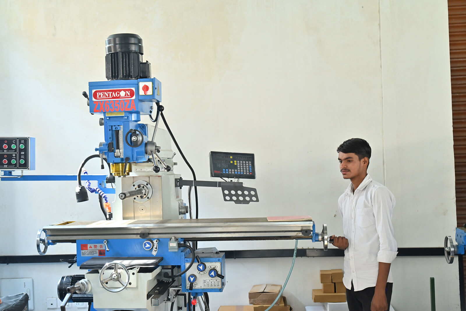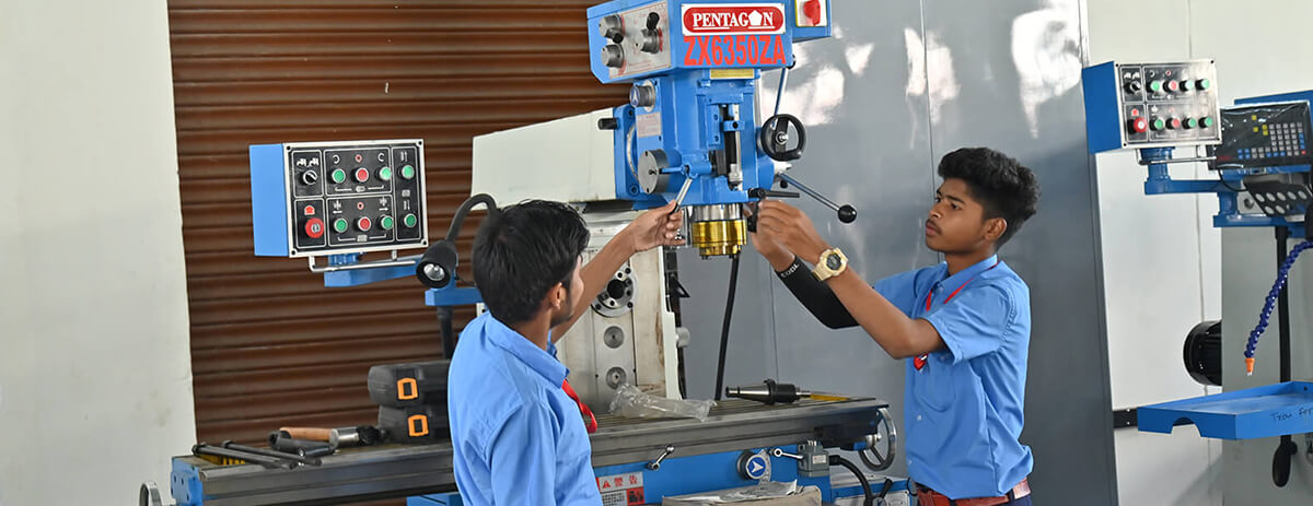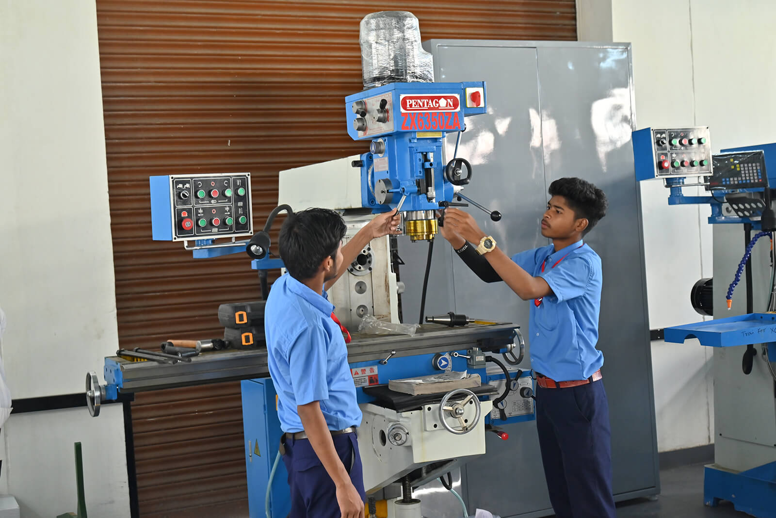 FIRST YEAR: In this year, the practical part starts with basic fitting work to make job as per specification applying different types of basic Fitting and machining viz., Drilling, Turning, Milling and Grinding operations. The trainee will be able to Produce components by different operations and check accuracy using appropriate measuring instrument. Apply different fits for assembling of components as per required tolerance, observing principle of interchangeability and check for functionality. Produce components involving different operation on Lathe, Milling and Grinding machine observing standard procedure and check for accuracy. The candidates also learn about basic computer operation such as MS-Office and basic troubleshooting related to the computer. The welding and brazing are also covered during this year. The safety aspects cover components like OSH&E, PPE, Fire extinguisher, First Aid and in addition 5S of Kaizen is being taught.