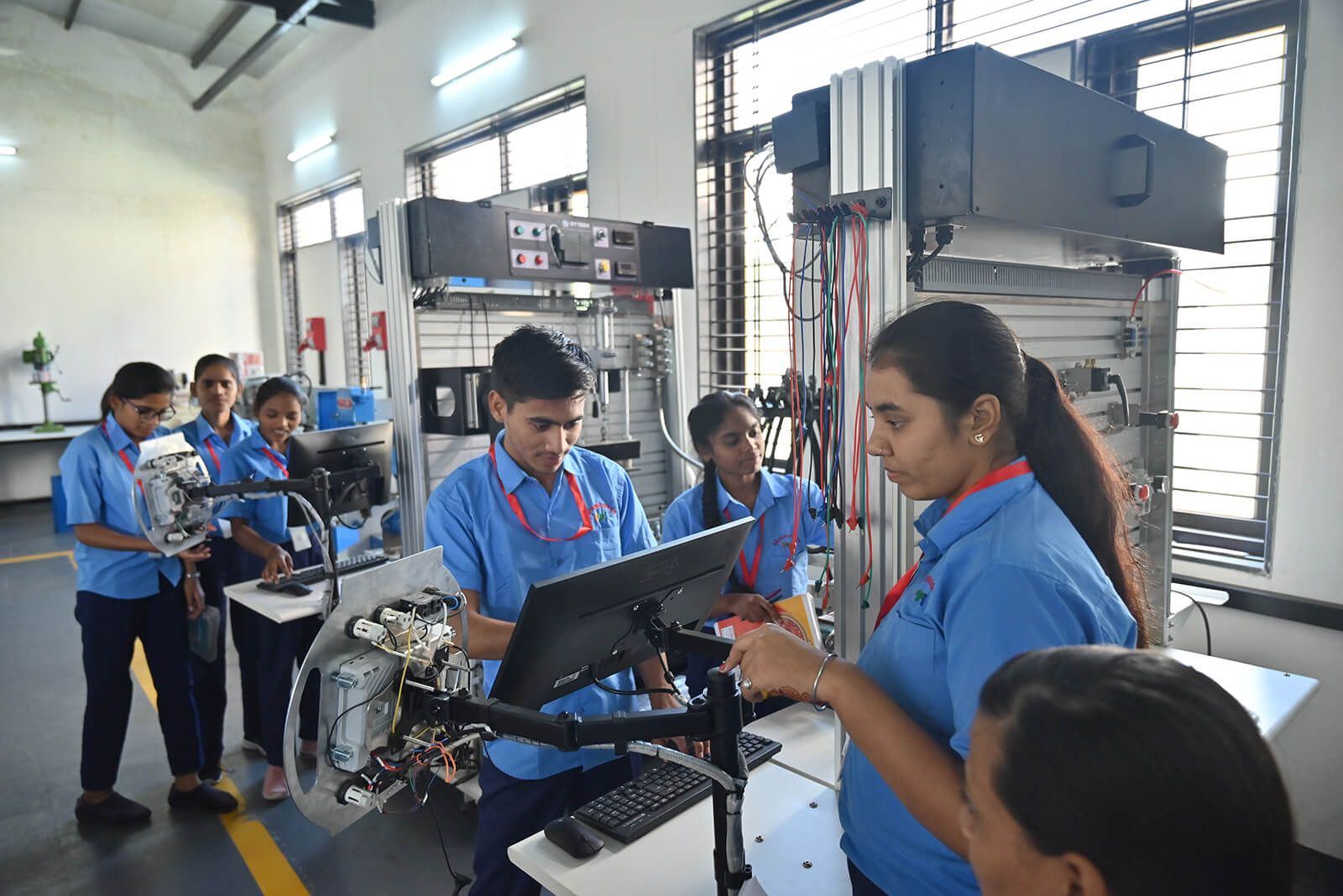 The Trainee gets awareness on Robotics and its application, the trainee will be able to develop, test and troubleshoot circuits using simulator software for Electrical, Electronics, Hydraulic and Pneumatic systems. Able to fabricate and assemble while working model project on Mechatronics [Example: Project-“Pick and Place Mechatronics system” involving Fitting, Drilling, Turning, Milling, Grinding, Electrical wiring, programming, Hydraulic circuit assembly, Pneumatic circuit assembly, Drives, system assembly and Interfacing, functional testing, trouble shooting and repair. Safety measures in each stage.]